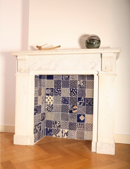 Custom made tiles for special places, you see from left to right: the Japanese textile motifs painted on handmade tiles ( 11 x 11 cm ) for a house close to the Sieboldmuseum, Leiden. Butterflies and caterpillar for a bedroom. Coral, lemon and orange tree with birds for the living room. Animals behind the stovepipe, a Delfts blue fireplace for expats returning to Washington after years in Holland, a booklovers chimney in an eco farmhouse painted in natural wood colors. Two ladies dressed in gown made of, among other things, fishes, flowers, leaves, seaweeds, shells, snakes, patterns, in this piece of 2009 I tried to reduce the human parts to a minimum, to see what it needs to make a picture a portrait; only the hands and eyes - and not even all.